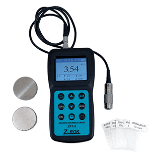 The ZPT-6 utilizes a rugged probe that can automatically detect a Ferrous or Non-Ferrous substrate and comes with 2 substrate samples (steel, aluminum), 4 calibrated thickness samples, carry case, batteries and operation manual.