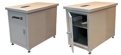 The Phase II hardness tester floor stands are sturdy, heavy metal cabinets for securing your Rockwell, Brinell or Vickers hardness tester.