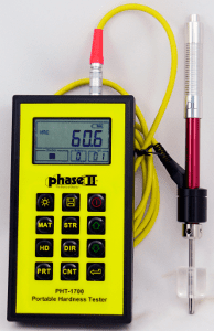 This dedicated portable hardness tester is designed to test gear teeth and other difficult to access applications. The 1740 is an economically priced portable hardness tester that is loaded with the same features found on the base 1700 version. The 1740 portable hardness tester is capable of measuring the surface hardness of a broad variety of metals on flat and round surfaces. This instrument comes complete with a dedicated DL impact device, calibrated test block and rugged carry case. The PHT-1740 Portable Hardness Tester can perform tests that easily convert to the most popular hardness scales including Rockwell, Brinell, Vickers, Shore, etc.