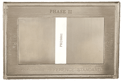High quality Surface Roughness calibration standard for portable surface roughness gauges. Ra values of 119.5 and 16.1; individually serialized and available certified to NIST. The Phase II surface roughness Reference Standard provides a reliable calibration tool which permits the technician to calibrate surface analyzing equipment to its peak efficiency. The SRG4600-500 surface roughness reference standard shows the actual patch mean values of low and high microinch surfaces. The surface of the Precision Surface Roughness Reference Standard consists of a series of parallel, uniform, “V-shaped” grooves having an included angle of 150° between the sides. Since the surface character of the Surface Roughness Precision Reference Standard is unlike normally machined surfaces, it is not recommended for use in visual and actual comparison.